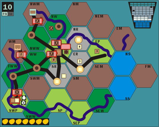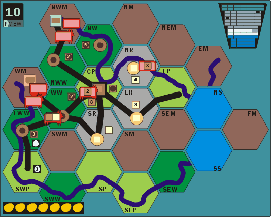 Score: 800 (6 shares, 1 coin, 2 gold, 2 wonder rows)